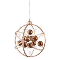An LED pendant with a polished copper finish. A mix of clear and copper plated balls hang at various heights from the two crossing horizontal hoops. Height adjustable at time of fitting.