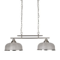 Suspending from a solid and sturdy ceiling bar, the chunky satin silver chain reaches 2 bars before reaching the lights. From the bistro collection, this 2 light item exudes sophistication and is perfect for a classic home setting. The ribbed holophane glass is complimented by a satin silver trim. Matching Wall lights available.