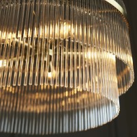 Beautiful contemporary interpretation of the chandelier in antique brass plated finish. Decorative clear glass rods diffuse the light to create an inviting ambience.