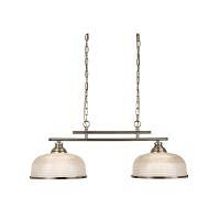 Suspending from a solid and sturdy ceiling bar, the chunky satin silver chain reaches 2 bars before reaching the lights. From the bistro II collection, this 2 light fitting adds sophistication and is perfect for a classic home setting. The ribbed holophane glass is complimented by a satin silver trim.